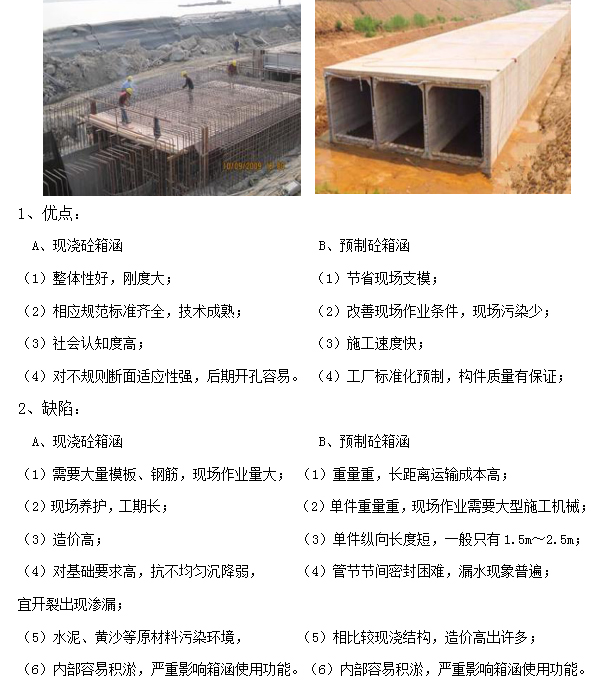由鋼筋混凝土或圬工材料制成箱形管節的涵洞,可用來輸水、排水、蓄水、行洪,過人及車輛通過。箱涵施工一般采用現澆,也有部分采用預制砼。其優缺點如下:
