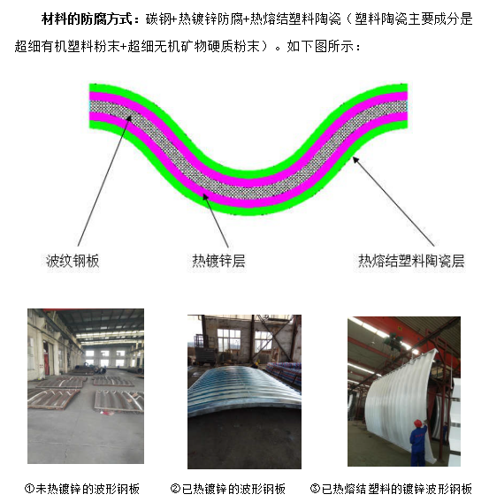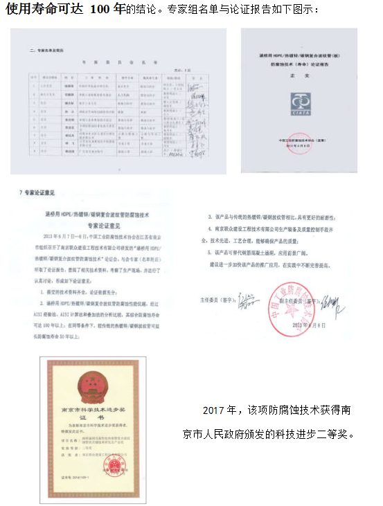 2010年,針對各地公路用熱鍍鋅波紋鋼管涵洞的腐蝕條件和行業防腐要求, 我公司與中國防腐蝕協會及南京工業大學、南京工程學院、中國石化集團金陵石化公司等單位合作研究,借鑒及創新了其它領域的高壽命的成熟防腐技術,將有機材料與無機超硬質礦物材料融合,成功的取得了埋地用鋼結構的熱浸鍍鋅加熱熔結塑料陶瓷的綜合防腐技術,并已在國內高速公路埋地式鋼質波紋管涵洞結構中運用,效果顯著,獲得行業好評。2017 年,該項技術獲得南京市人民政府頒發的科技進步二等獎。